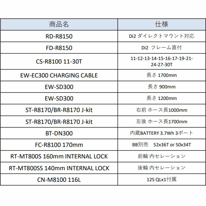 キット内容:リアディレイラー、フロントディレイラー(直付)、カセットスプロケット(11-30T/12s)、EW-EC300チャージングケーブル(1700mm)、EW-SD300
