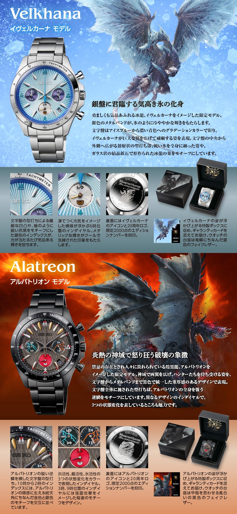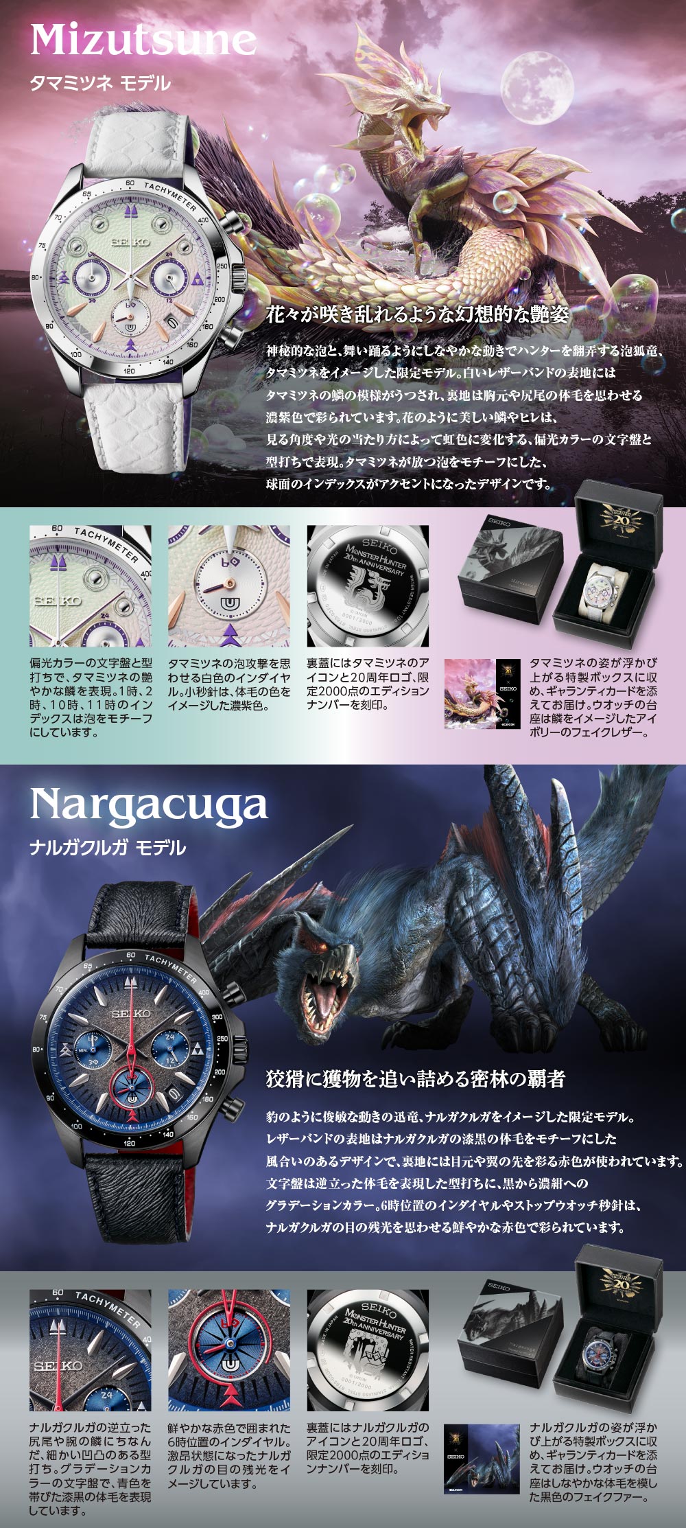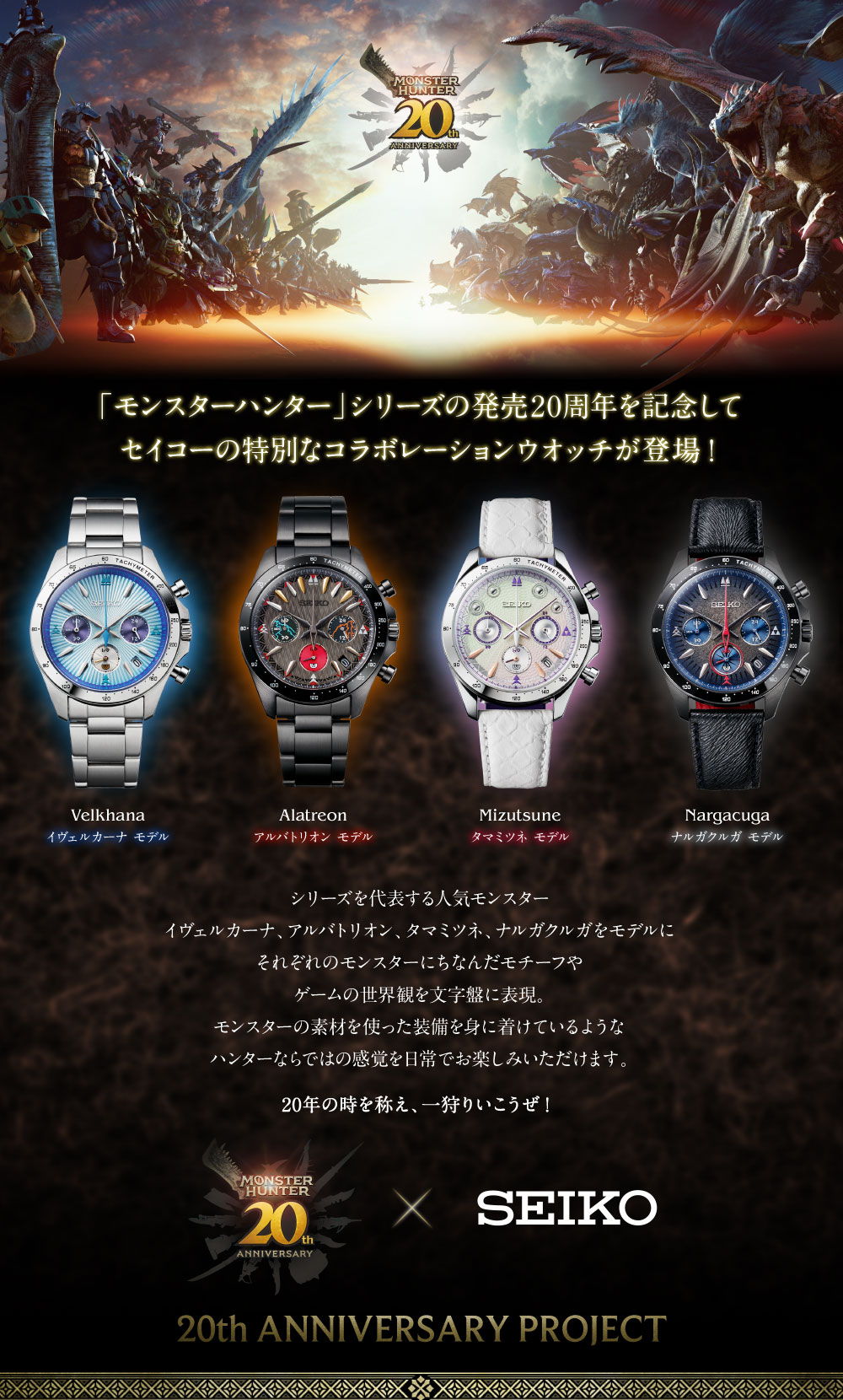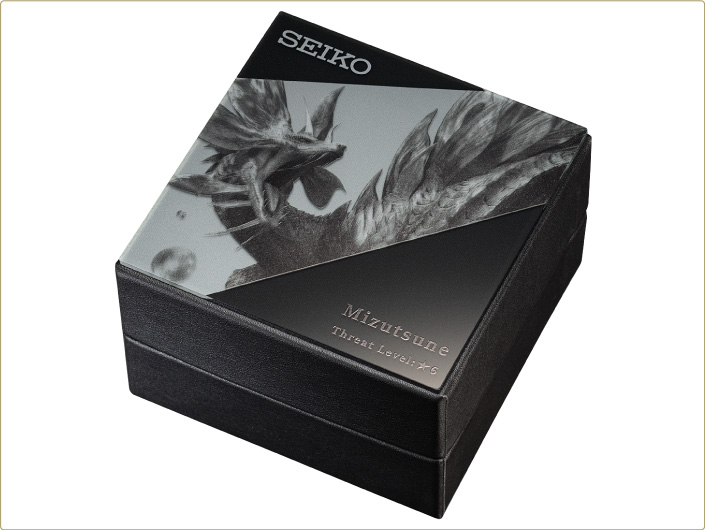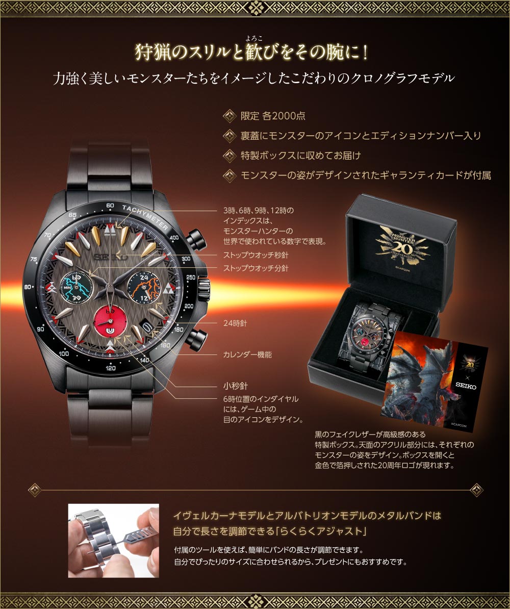 ●材質:ケース・裏蓋=ステンレススチール バンド=イヴェルカーナ・アルバトリオン/ステンレススチール、タマミツネ・ナルガクルガ/牛革(裏側は合成皮革) 風防=カーブハードレックス