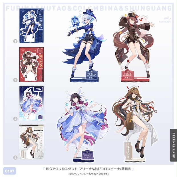 【C107】BIGアクスタ(フリーナ / 胡桃/コロンビーナ/瞬光)受注予約 ※非公式ファンメイドグッズ ■予約受付期間 ~2026年1月25日(日)23:59まで■ ■商品お届け時期~2026年3月中旬~下旬頃■ ※受注〆切後に必要数を発注、製造開始となります。また、BOOTH倉庫の混雑により入庫にお時間を要し、お手元に届くまでにお時間をいただく場合がございます。そのため、予定時期より遅くなる場合におきましてはショップのトップページにてお知らせします。 ※海外発送はtenso.comをご利用ください For overseas shipping, please use this forwarding service.↓ https://www.tenso.com/en/static/lp_shop_booth ----------------------------------------------------------------------- ●BIGアクリルスタンド全4種 (1)「フリーナ」(2)「胡桃」(3)「コロンビーナ」(4)「葉瞬光」 ・キャラ・ネーム・台座の3点組み立て式 ・仕様:B5サイズ 182×257mm /アクリルフレーム ※フリーナと胡桃の2種は表面に保護フィルムが貼られていますのでご鑑賞の際は剥がしてからお楽しみください。 ------------------------------------------------------------------------ サークル:ETERNAL LAND 発行:2025.12.30 コミックマーケット107 キャラ:「原神」フリーナ・胡桃・コロンビーナ 「ゼンゼロ」葉瞬光 仕様:B5アクリルフレーム *こちらは非公式のファンメイドグッズです。 *BOOTH倉庫の混雑によりご注文完了からお手元に届くまでにお時間をいただきます。お届け時期変更の場合はショップのトップページにてお知らせします。 *発送状況・初期不良や破損は、BOOTHへお問い合わせをお願いいたします。 *ご注文者様都合による返品・返金はお引き受けできません。 *ご注文前に必ず「特定商取引法に基づく表記」をご一読ください。